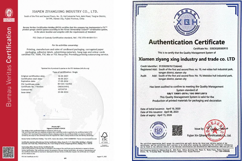 A: we have FSC, FDA, SGS, VOC, and compliance with environmental regulations such as RoHS, 94/62/EC, and US TPCH. Our factory has ISO9001 certification, as a leading international packaging supplier and exporter.